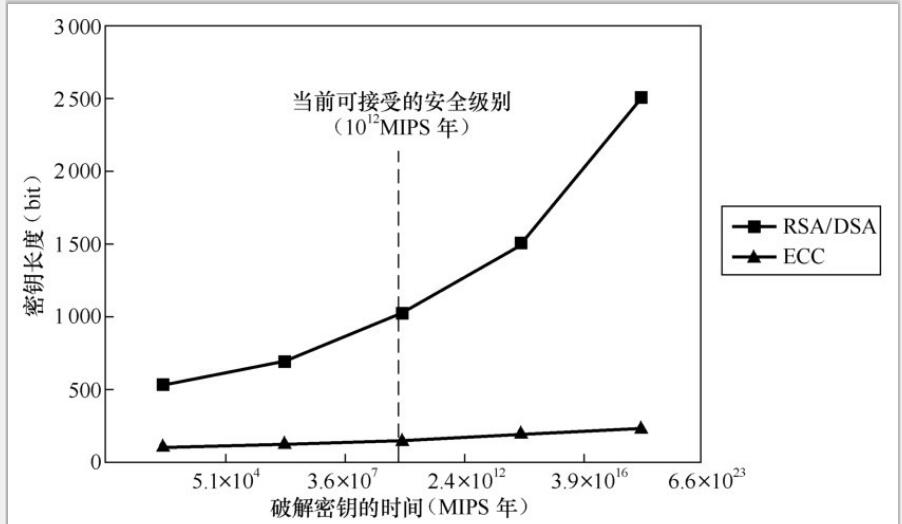从图3-3可以看出,在破解密钥所需时间相同的前提下,RSA的密钥长度比椭圆曲线的密钥长度增长快得多。