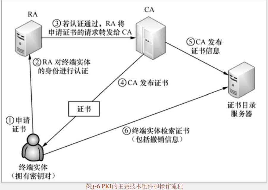 PKI安全体系对外公开,提供了一系列对外接口和安全标准。PKI技术中包含下述实体功能的软/硬件的集合:终端实体(EE)、注册机构(RA)、证书机构(CA)、PKI目录。PKI主要的技术组件和操作流程如图3-6所示。