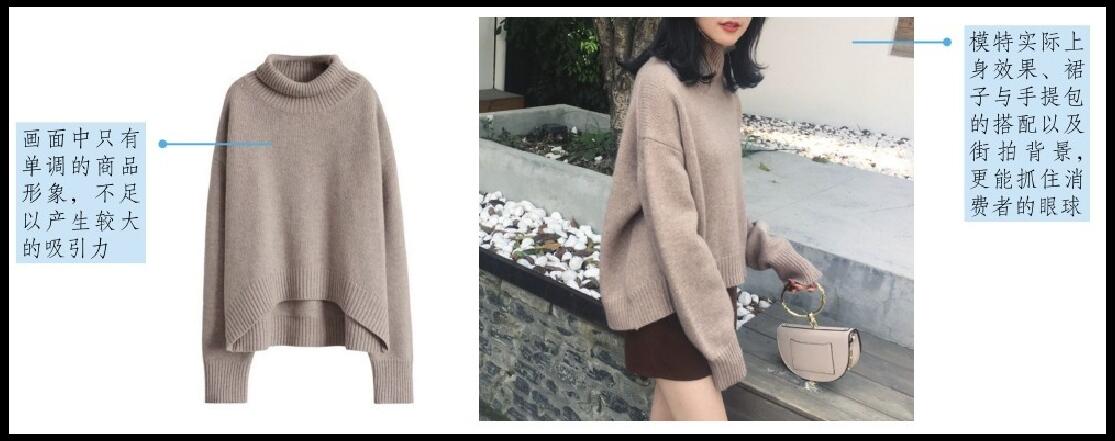 消费者在移动端购物主要是通过文字描述和图片展示来了解商品,这些都属于视觉营销中“视”的范畴。因此,移动电商APP开发之后视觉营销的首个关键点就是打造出注意力,将消费者的视线吸引过来。消费者的视线总会被一些较为特别和漂亮的事物所吸引,如两张商品主图尽管要表现的商品是一样的,但经过模特展示的图片更能吸引消费者的注意,如图1-20所示。