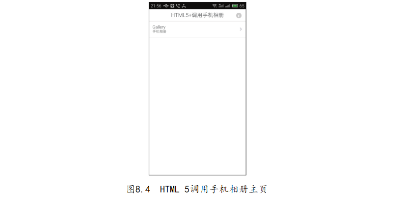 代码第09~13行定义了打开手机相册的列表,其中第09行代码<li>标签内定义了一个JS脚本方法clicked(this.id),用于打开手机相册页面,而“this.id”定义的页面地址就是“plus/gallery.html”。找到“plus”目录下的“gallery.html”页面,具体代码如下:【代码8-3】