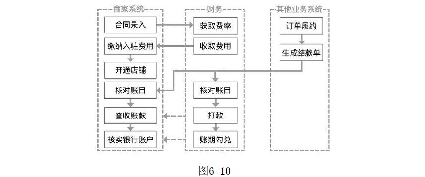 如图6-10所示。结款单会按照账期进行处理,结款单的数据来源于订单,我们可以设定一个周期,比如5天,订单完成5天后进入可结算状态,通过日结作业将结款数据进行计算保存。每个账期到期日期前一天(比如账期15天,第14天时)对日结作业处理的数据进行汇总,计算出账期的数据。将计算的最终账期结算数据(即结算单)同步给商家和财务,由双方进行核对确认,确认无误后,财务进行打款并完成账期的勾兑。更新勾兑完成的订单与账期结算单的状态并通知商家,商家获取支付完成的信息后可以核对银行账户金额。需要注意的是,结算时的计算公式应该是:本期结算金额=本期商家应收账款-本期商家应付账款-往期拖欠账款。当本期应收>本期应付+往期拖欠金额时,则正常出账,拖欠金额为0,账单结算金额=本期应收-往期拖欠金额-本期应付;当本期应收<本期应付+往期拖欠金额时,则账单结算金额为0,往期拖欠金额=本期应付+往期拖欠金额-本期应收。拖欠款与应付金额的抵扣逻辑为:先抵扣欠款金额,后抵扣应付。本期应付一般包括商家本期消费金额,如购买第三方应用服务,还有逆向订单的费用和金额。逆向订单包括发货报缺、自助退货和拒收等。逆向订单的金额需要和正向订单金额分开统计计算。