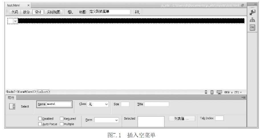 第1步,启动Dreamweaver,新建文档,保存htest.html。将鼠标指针定位到预定义位置,选择【插入】【表单】【选择】命令,插入一个空的下拉菜单控件,在【属性】面板中设置Name为menul.如图7.1所示。