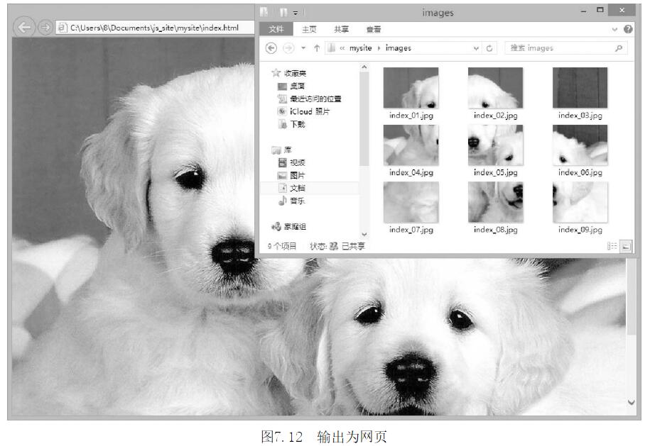 第4步,单击【保存】按钮,输出并存储切片和网页,可以在当前站点目录下看到所存储的HTML文档和images文件夹,在images文件夹中保存着所有的用户切片图像,直接双击HTML文件名,即可在网页测览器中预览网页效果,如图7-12所示。