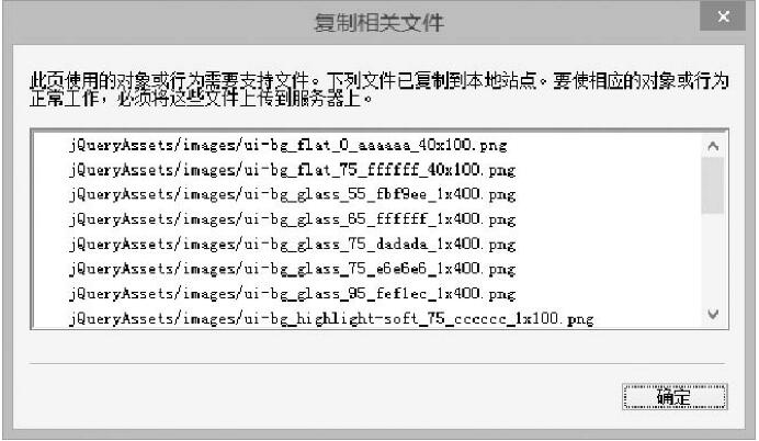 第4步,按图7-61所示设置完毕,保存文档,则Dreamweaver会弹出对话框.要求保存相关的技术支持文件,如图7-62所示。单击【确定】按钮关闭该对话框即可。