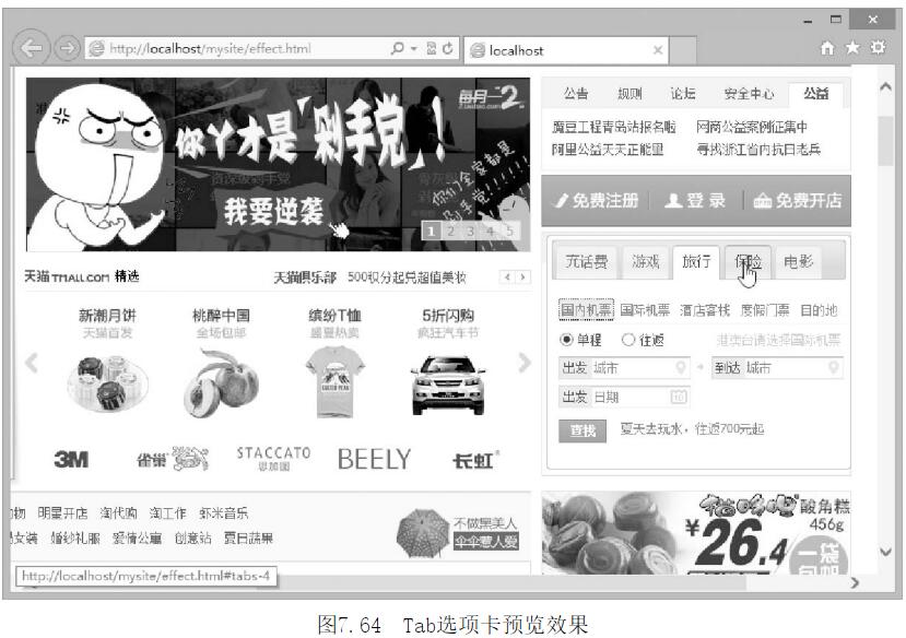 第6步,切换到代码视图,在<head>标签中添加<styletype:”text/css”>标签.定义一个内部样式表,然后定义两个样式.修改Tab选项卡默认的样式,其中#Tabsl>div定义选项卡容器样式,清除容器包含框的边界和补白,避免默认的边界对包含内容的影响。#Tabsl>ul>li>a用来控制Tab选项卡标题栏字体大小和左右补白,以便适应当前页面的栏目布局。设计如图7-63所示。