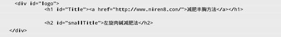 如图1-4所示的heading标签优化举例,注意两个标签措词不同,但均包含了网站的主要关键词。这里值得说明的是,有的网站设计感很强,很难给heading标签预留出合适的位置,那么这里可以采用的是,将页面中出现的第一个Img放在h1标签里,并在其ALT属性中写入网站名称或关键词。对于SEO的效果来说,经尝试是有作用的,至于效果,笔者个人认为肯定会比heading标签里的文字直接出现在页面上要略差一些。
