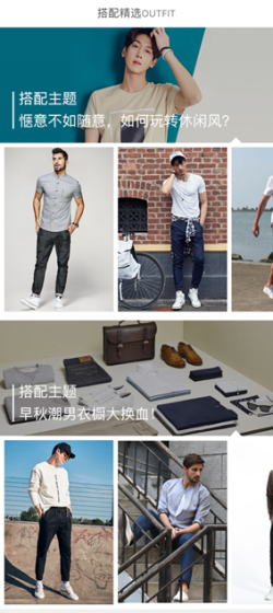 下半部分Banner采用了176*176PX(1:1)的小图。这样图片比例符合之前分析的专题图适合16:9,商品图适合用1:1。这样的大小比例看起来可以让版块之前区分的很清楚。当然如果下半部分图片一定要使用小图,否则看起来层次就混乱,。例如男衣邦的首页,上图和下图的比例看起来非常的接近。模块层次区分的就不是非常好。