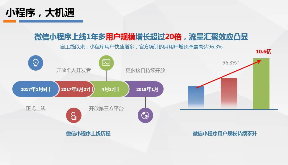 小程序比App的开发更加简单,开发周期相对更短。要完成一个移动客户端的开发,至少需要一个后台开发、一个Android客户端开发和一个iOS客户端开发。因为不同系统客户端的开发模式不同,创业者在付出了高昂的人力开发成本后,很难在短时间内形成较好的用户体验,生产出来的产品也很难被大众认同。同时,App的开发经常需要适配各种主流机型,而小程序的适配较简单,开发周期相对较短。