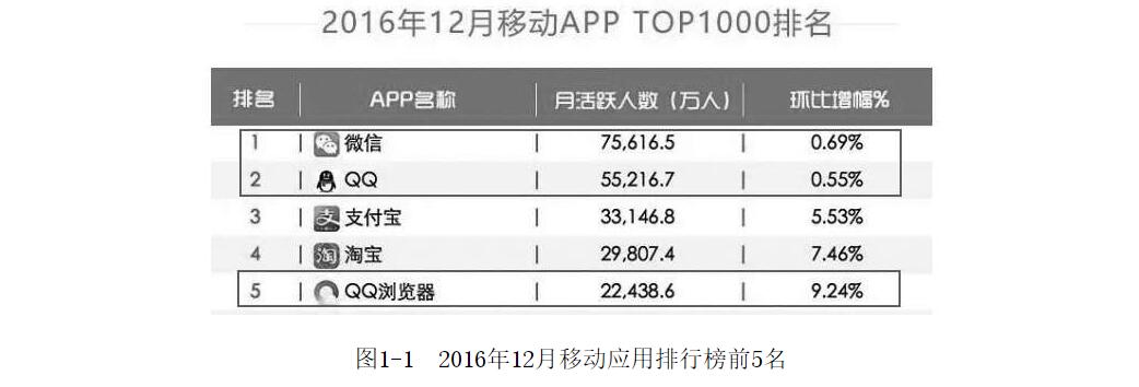 当腾讯大胆地提出应用号的概念,想要解决用户无法直接获得移动互联网内容和服务的痛点时,小程序开发公司似乎看到了这个时代又一个新起点和新入口。2016年12月易观数据统计的移动应用排行榜前20名显示,腾讯的移动应用占了30%,其中,微信位居榜首、QQ第二,前5名如图1-1所示。