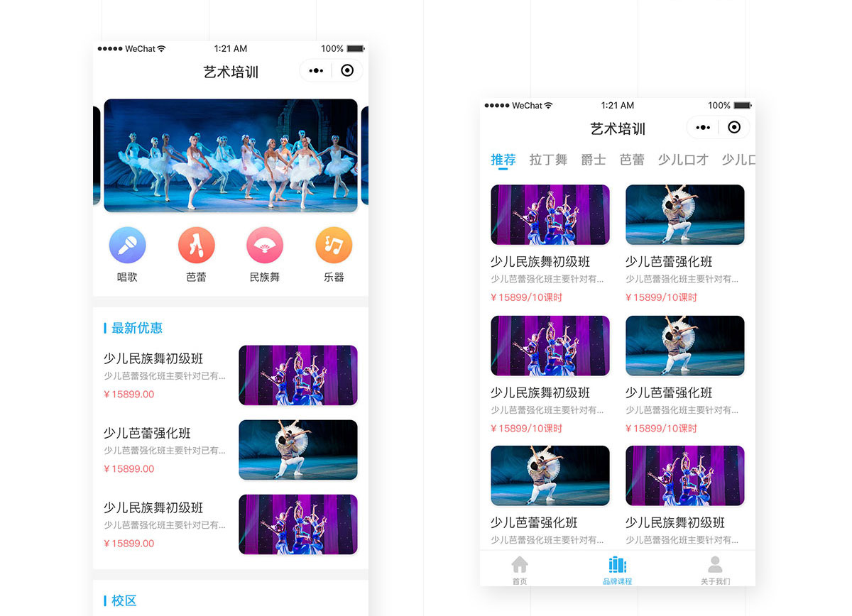 该小程序主要针对少儿及儿童的艺术教育培训机构,用于品牌的课程的宣传及推广,首页课程分类展示,并推荐最新优惠的课程,使家长第一时间找到适合孩子的艺术课程,可在线预约,教师会在后台收到预约信息。