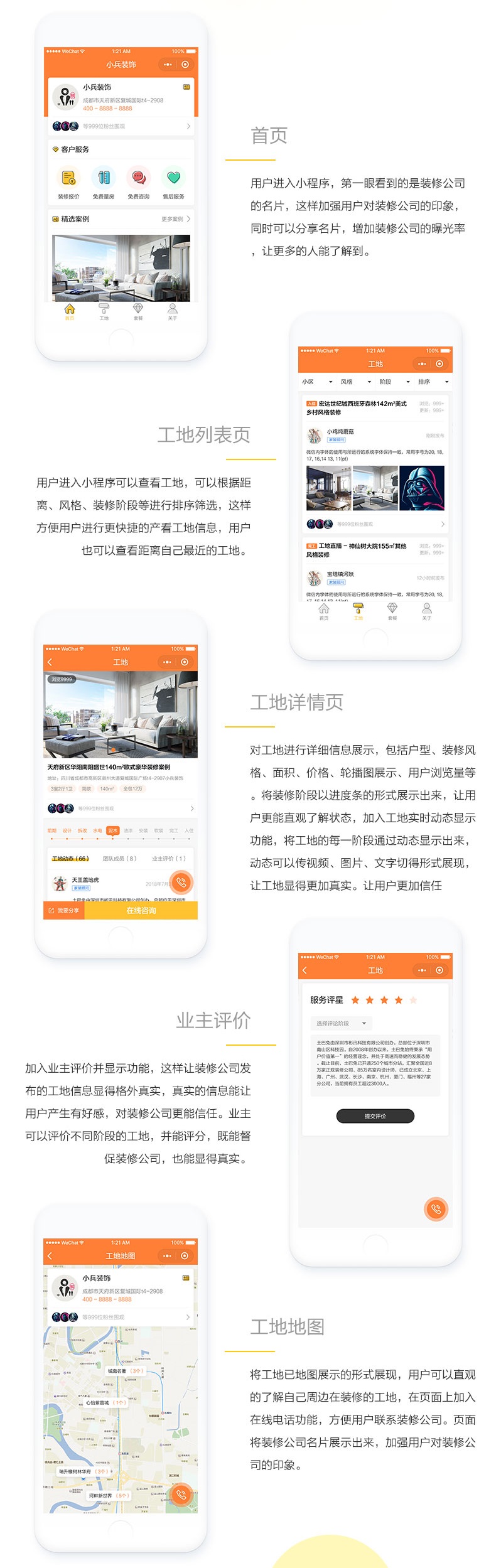 小兵装饰基于对装修行业的分析,我们在小程序中加入了名片功能、动态发布功能、动态视频功能、业主评价功能、点赞功能、导航功能、在线咨询功能、在线拨号功能、动态地图功能等。动态发布功能和业主评价功能最大限度的增加了装修公司工地案例的真实性,让用户对信息产生真实感,在真实感的基础上用户才能进一步的了解装修公司的更多信息。