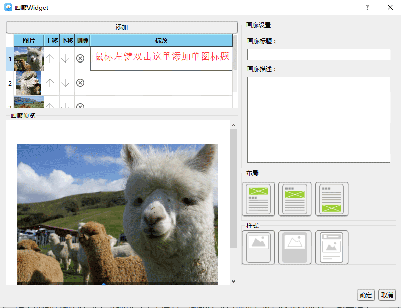 答:如下图是画廊widget界面,鼠标定位到画廊单图标题处后左键双击标题空白处添加单图标题,如下图。