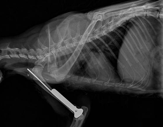 5. 治疗 本病例胸腹部X线片检查未见明显异常,但鉴于患猫体况较差,术前3天给予输液预防继发感染、增加营养等,待患猫体况好转后,实施内固定手术。 丙泊酚诱导麻醉、异氟烷维持麻醉后,患肢备皮消毒。