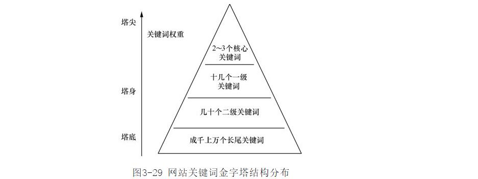 选好关键词后,需要对关键词进行有序的排列。一般来说,网站的关键词分布应该符合金字塔形结构,依据网站关键词的权重将关键词分为塔尖、塔身、塔底三个部分,如图3-29所示。