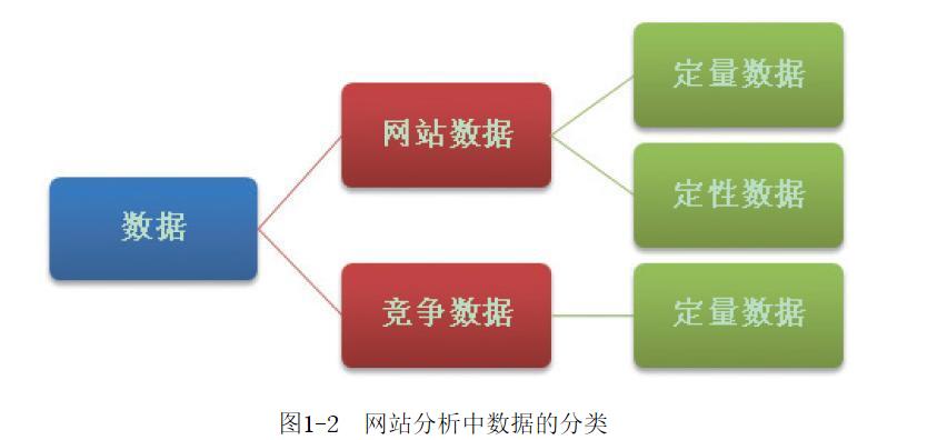 如图1-2所示,它们分别是来自网站自身的网站数据、来自竞争对手的竞争数据,以及定性数据和定量数据。网站数据用来衡量网站的表现,竞争数据用来了解竞争对手及行业变化,定量数据告诉我们网站中每天发生的故事,而定性数据则可以告诉我们这些故事发生的原因。图1-2 网站分析中数据的分类